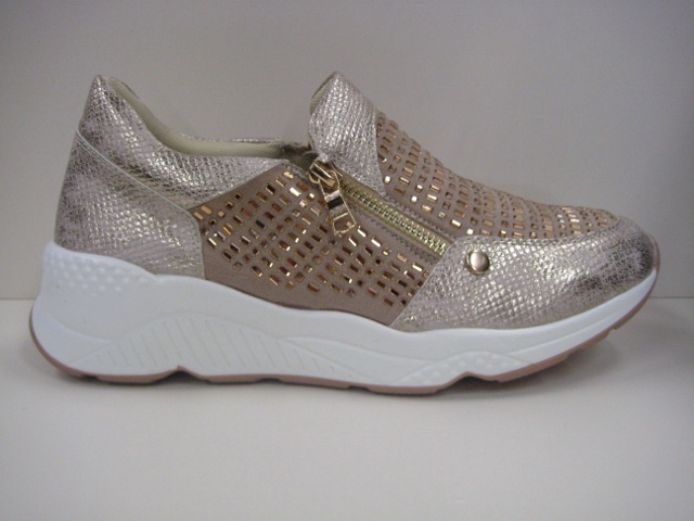 A sporty classic, this slip on shoe from Revel Heart has a lovely combination of soft metallic leather and sparkle! Double zip entry - perfect to slip on and go!