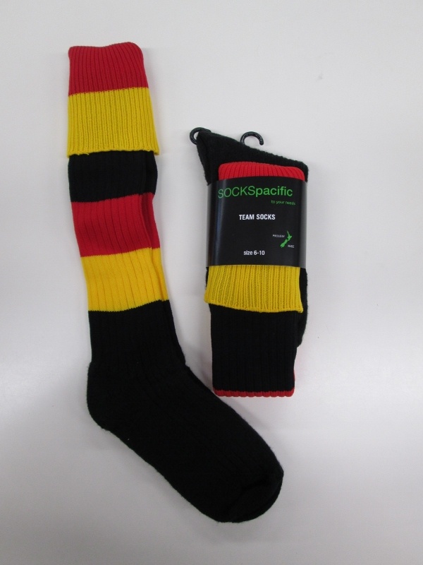 Clyde Earnscleugh Rugby socks. Red Black and Gold stripes.