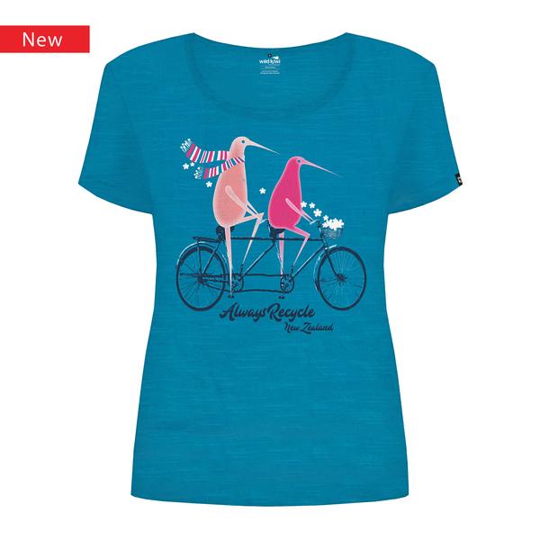 Show your support for a Clean, Green New Zealand. Wear our Wild Kiwi T-shirt featuring two NZ kiwi birds riding a tandem bicycle, with the phrase 'Always Recycle'.