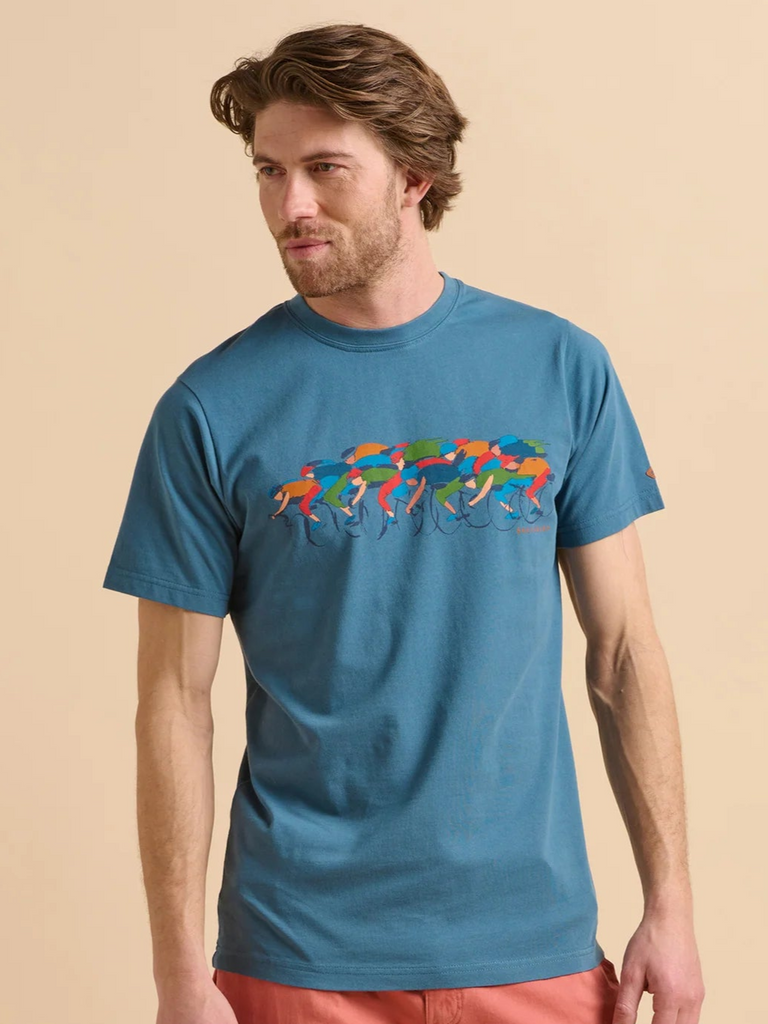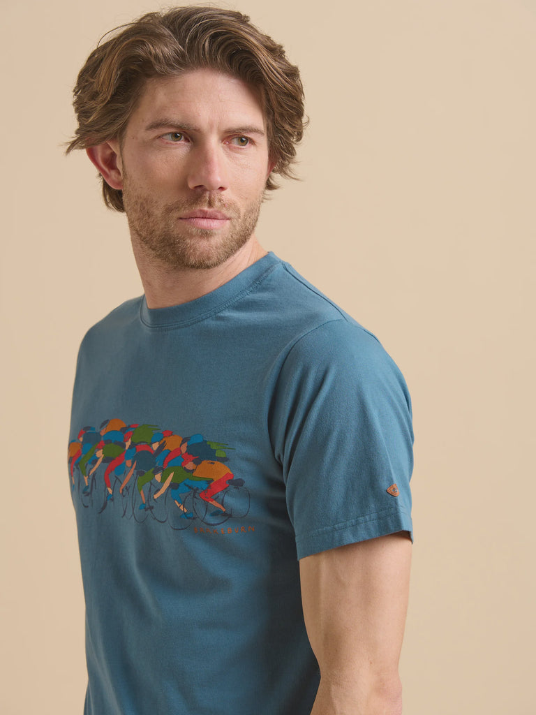 Channel the thrill of the race with this murky blue tee, depicting a vibrant group of racing cyclists in bold shades. It’s a dynamic design that captures the speed and energy of the sport, perfect for those who live life in full motion. Pair with casual shorts and sunglasses.