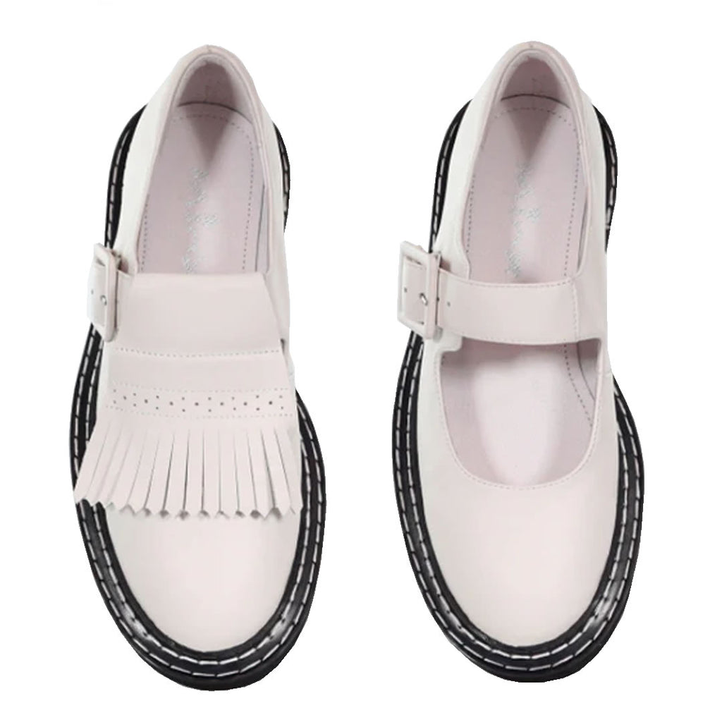 Cameo Fringe from Minx is a leather mary-jane shoe featuring a distinctive removable fringe detail.