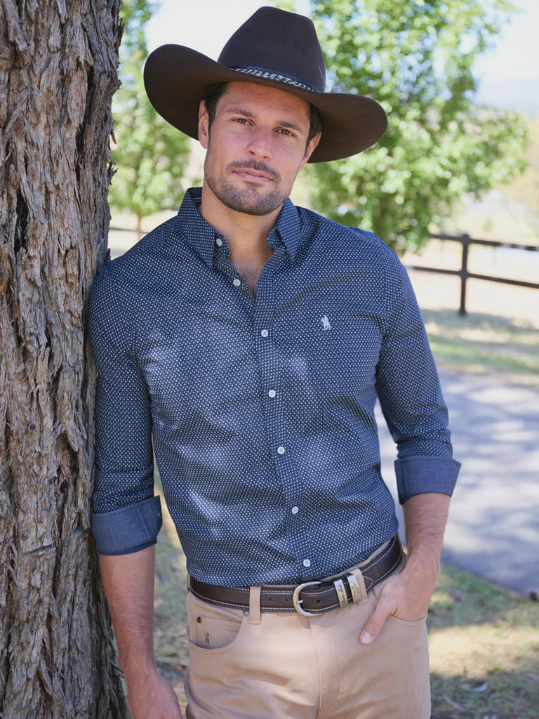 Tailored fit long sleeve shirt, easy care, fabrication, geometric print, stretch for comfort and movement, contrast chambray facing on inside, collar stand, internal neck stripe, taping, concealed collar peak, buttons, removable collar stays, horseman embroidery on chest