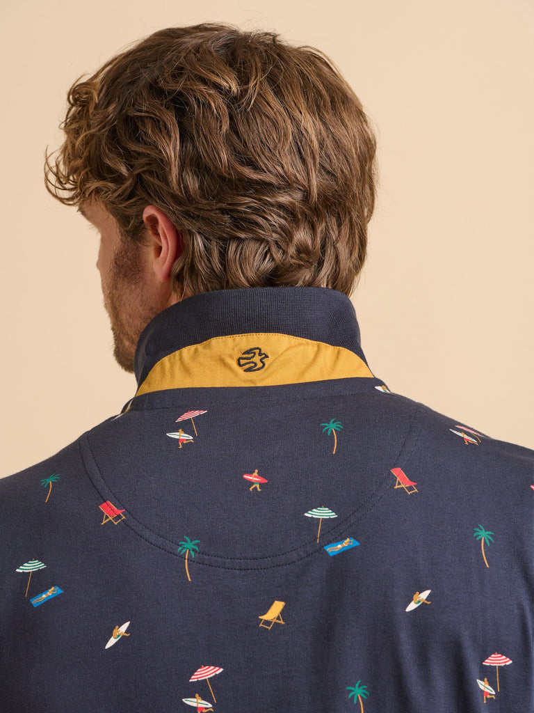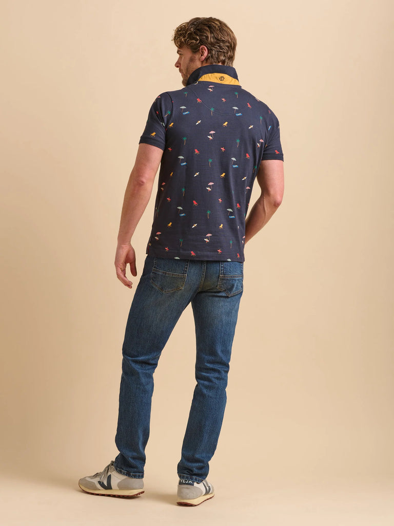 Set the tone for summer with this navy polo top, adorned with a vibrant beach scene of surfers and sunbathers. With discreet 'Brakeburn' embroidery on the chest, this top is perfect for pairing with chinos or shorts for casual days out in the sun.
