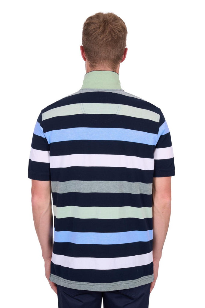 Concealed chest pocket, multi colour stripe design, rib collar and cuffs, premium quality canvas taping on front placket, contrast herringbone taping on inner neck and side seam splits, contrast button thread colour to match stripes, horseman embroidery on chest.
