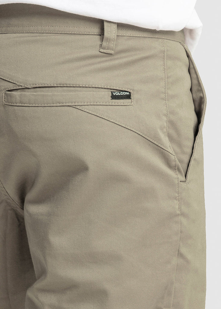 High versatility for all kinds of action. Crafted with a blend of cotton, partially recycled polyester, and elastane, they offer a modern, 5-pocket chino fit with a 21" outseam. The signature asymmetric back yoke and Volcom branding add a stylish touch to these pre-laundered, versatile shorts. Featured here in beige. Featured here in khaki.